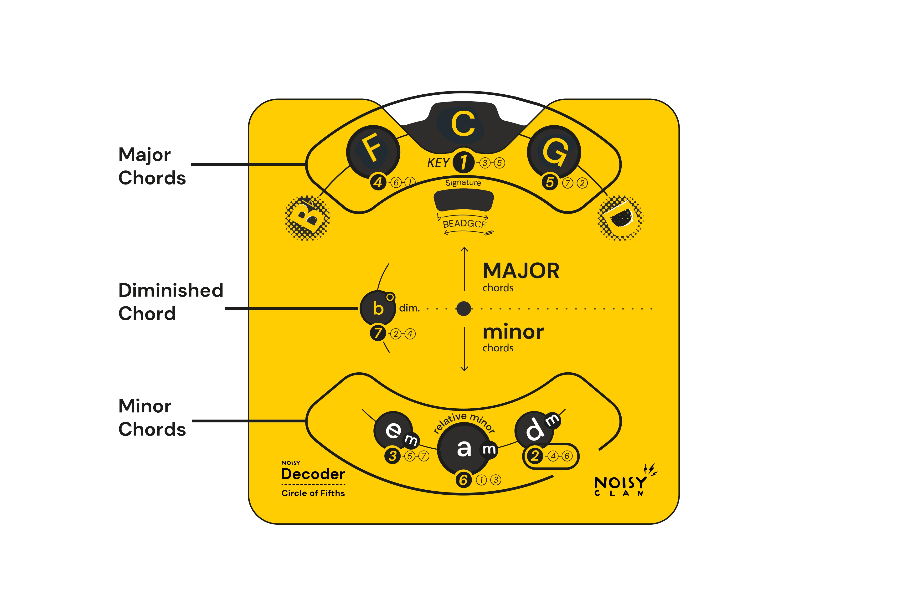 The major and minor chords are separated. The major chords sit on top, the minor chords at the bottom, and the diminished chord sits in the middle.